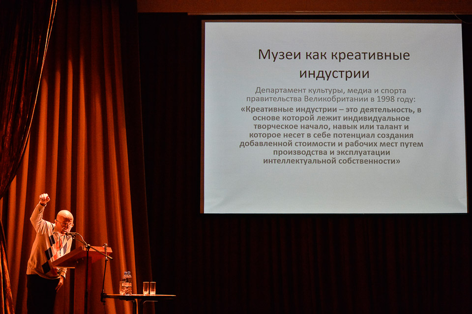 Куратор выставки «Новое. Избранное» Александр Клушин выступает перед участниками конференции