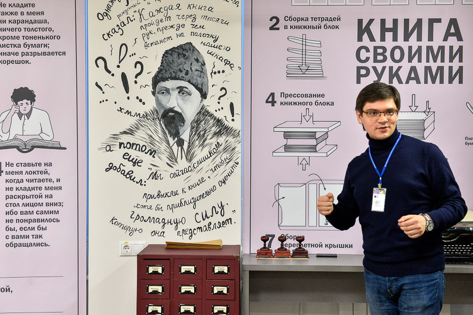 Экспозицию интерактивного музея книги представляет Станислав Ермоленко, начальник отдела ценных и редких книг Новосибирской государственной научной библиотеки