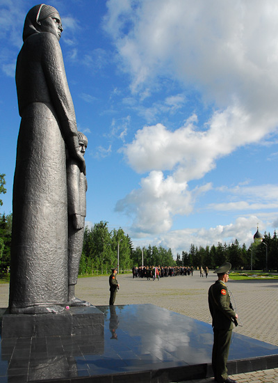 纪念建筑群的基础是 230 米高的象征性的《战争道路》,是用长方形小条石做的。它以 9 米高的《西伯利亚的母亲跟儿子》雕像起点。西伯利亚的妇女歪着头站在万里长的战争道路前。这就是一条有 1418 天内的辛苦、极力繁重的劳动、有泪水的道路。妇女的仪表表示我们同胞的性格特性——为了胜利她们经受住苦难、经受住一切考验、熬过跟困的战争岁月。男孩子的外形也是象征性的,他是一个战争时期的少年、他跟长大人一起缔造胜利、战争后把被破坏的祖国重建。雕像后的桦树是我们小祖国的象征、就是鄂木斯克的额尔齐斯地区。