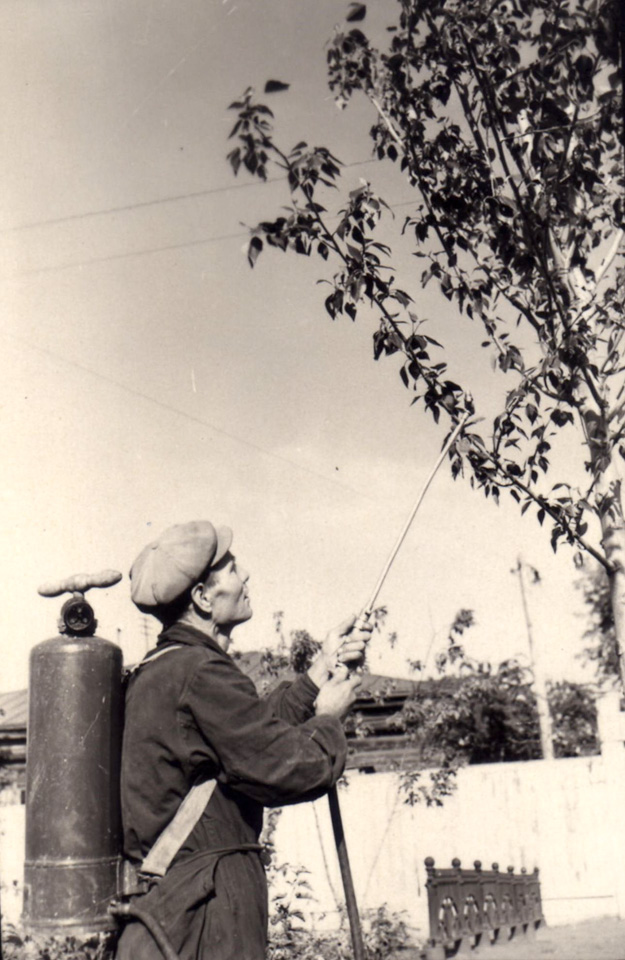 За растениями тщательно ухаживали. Рабочий дендросада опрыскивает дерево химикатами, чтобы защитить его от насекомых-вредителей