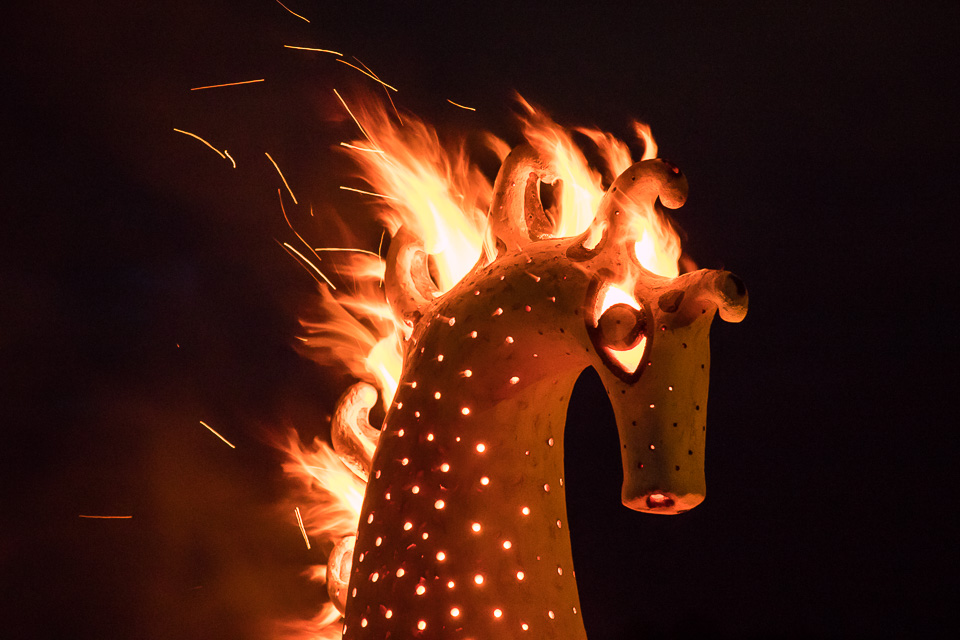 Целую неделю мастера трудились над двухметровыми анималистическими скульптурами, чтобы воскресным вечером эффектно обжечь их открытым способом на глазах изумленной публики.
