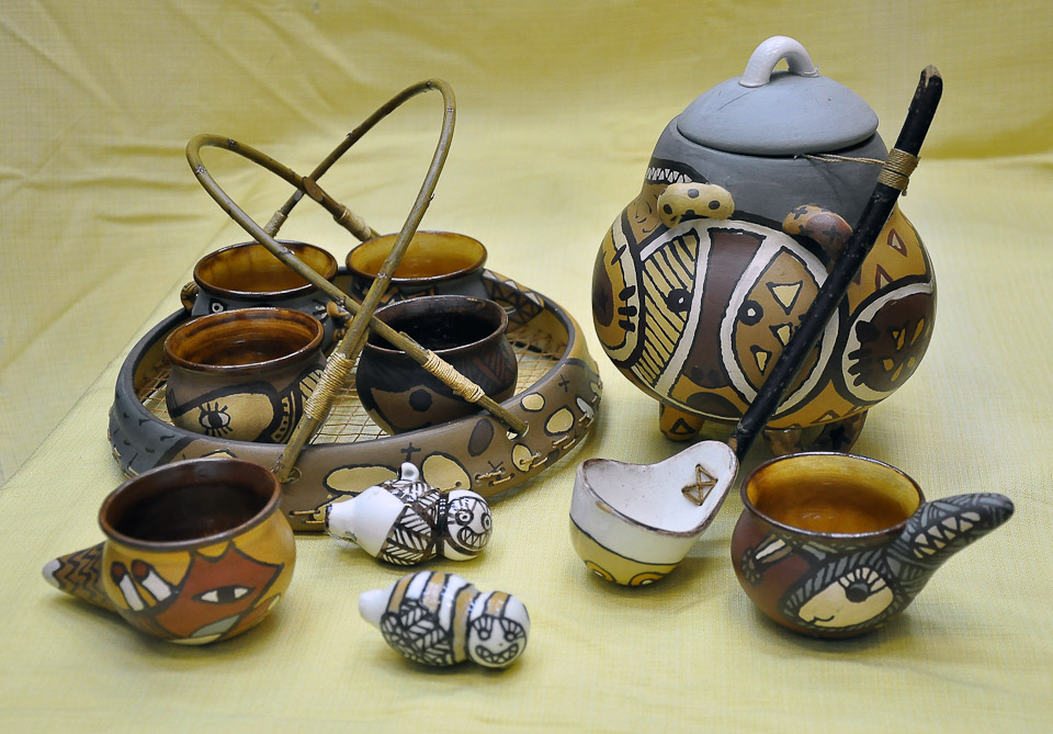 Анна Адаева (1961 г.р.). Детский питьевой набор для компота «Теремок» на 6 персон из 12 предметов. 1990. Фаянс, ангобы, роспись, литьё, дерево, шнур