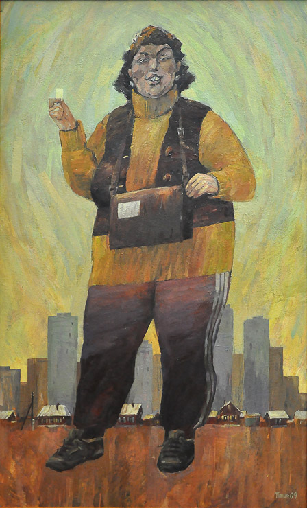 Тимур Инсинбаев. Триптих «Оранжевый автобус». Кондуктор. 2009. Оргалит, масло