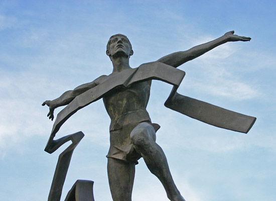 31 июля 2003 года была воздвигнута скульптура «Марафонец», которая стала первой в России композицией, посвященной марафонскому движению. Ее идея принадлежит двум омским скульпторам, постоянным участникам марафонов И. Бухарцеву и Г. Чиркину, а замысел воплотил московский скульптор В. Кириллов. Спортсмен, стремительно бегущий по дорожке навстречу финишу, стал символом Сибирского международного марафона. На постаменте памятника ежегодно высекаются имена абсолютных победителей марафонской дистанции в Омске.