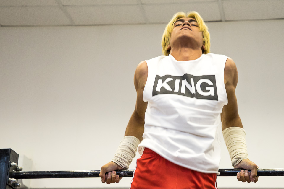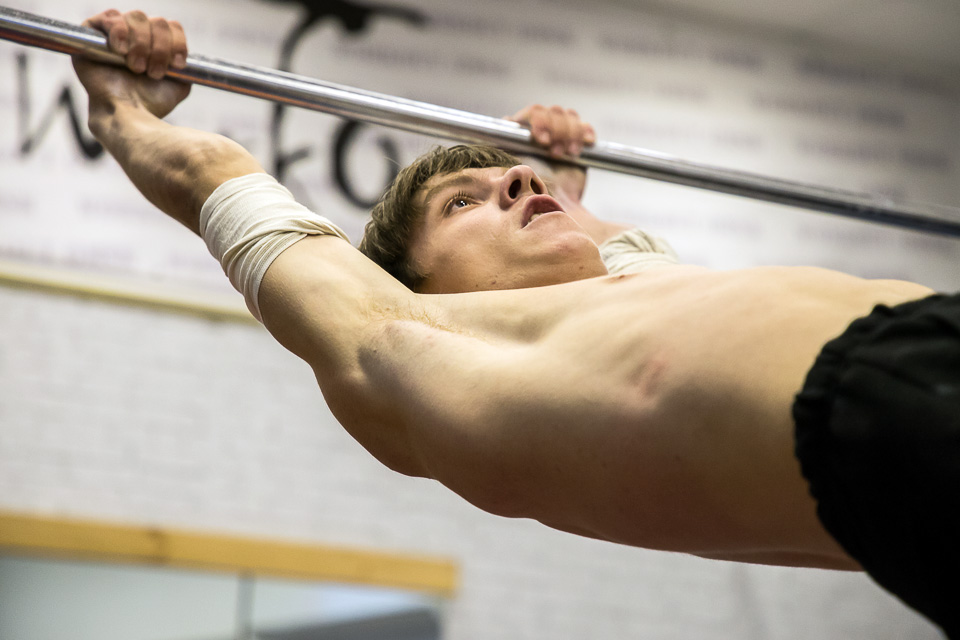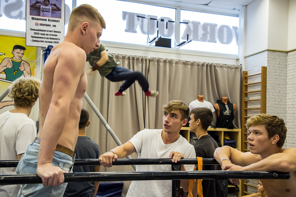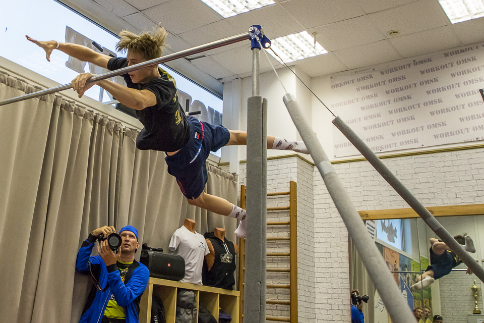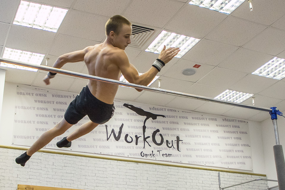 Пока атлет заканчивает отжимания на брусьях, на фоне идет спонтанная тренировка