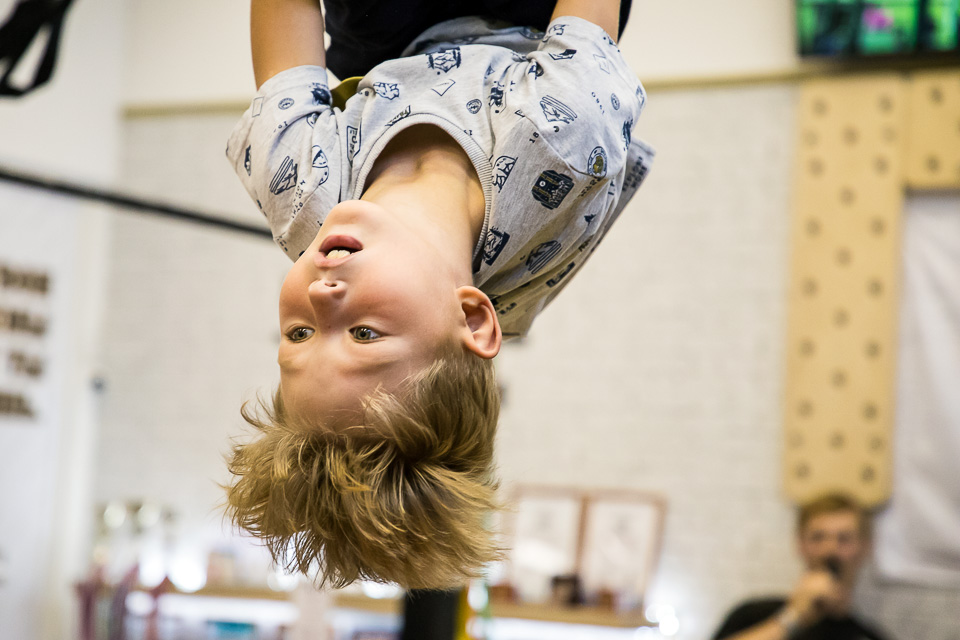 Самому маленькому участнику нужна помощь, чтобы оказаться на перекладине