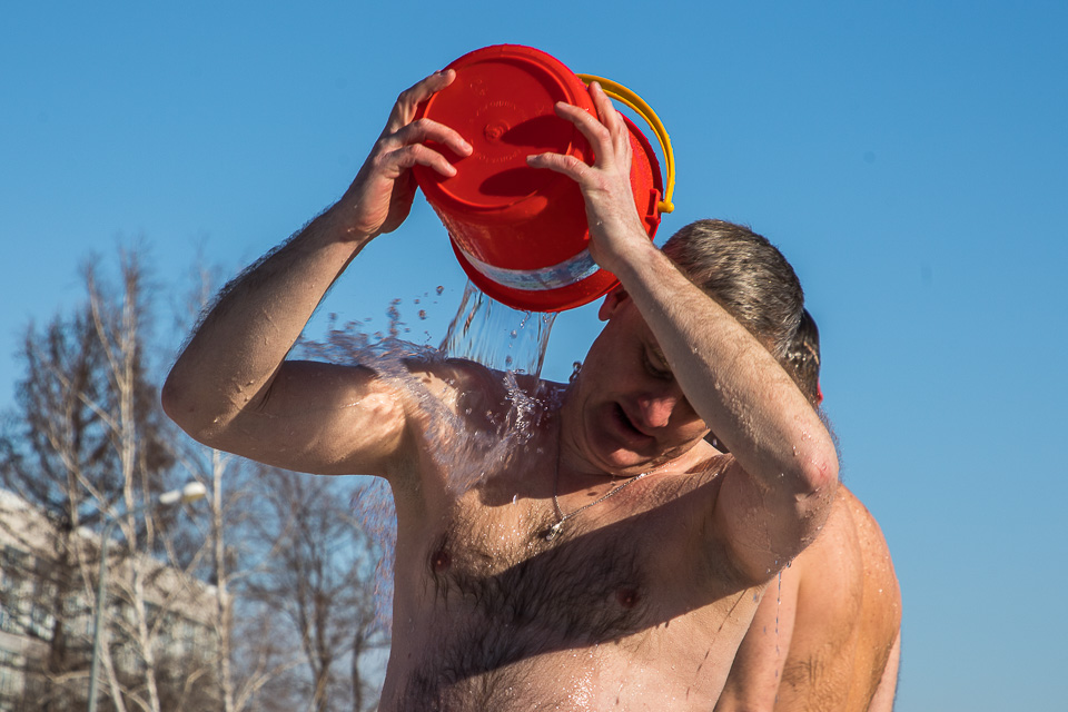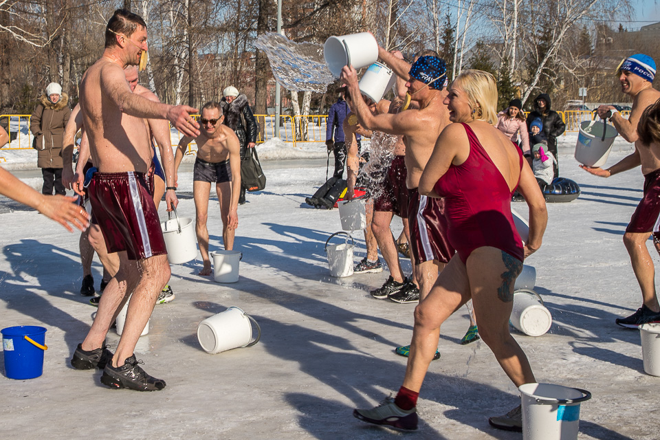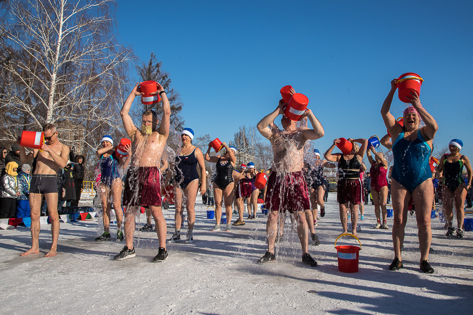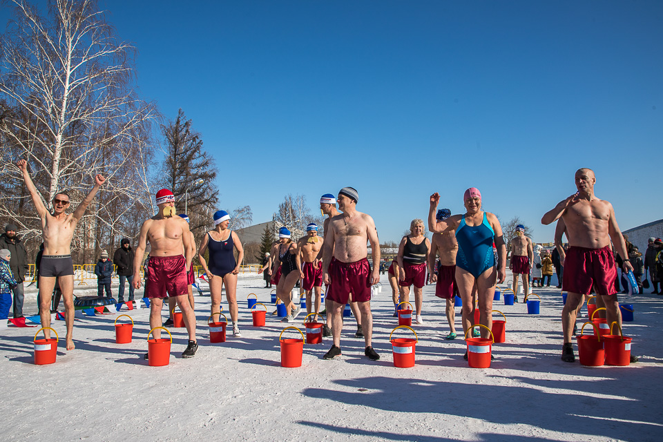 Участники омского клуба «Моржи» разминаются перед водной процедурой