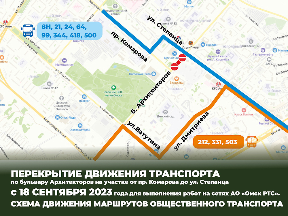 «Тот транспорт, который двигался с бульвара Архитекторов на проспект Комарова и вен обратном направлении, будет осуществлять движение по улицам Степанца и Туполева, а далее возвращаться на прежние схемы маршрутов. Как в прямом, так и в обратном направлениях, — рассказала Марина Расторгуева, заместитель директора департамента транспорта администрации Омска. — Часть маршрутов, которые использовали для проезда бульвар Архитекторов и следовали с правым поворотом на улицу 70 лет Октября, в оба направления будут перенаправлены по улицам Ватутина и Дмитриева, далее — по прежним схемам маршрутов».