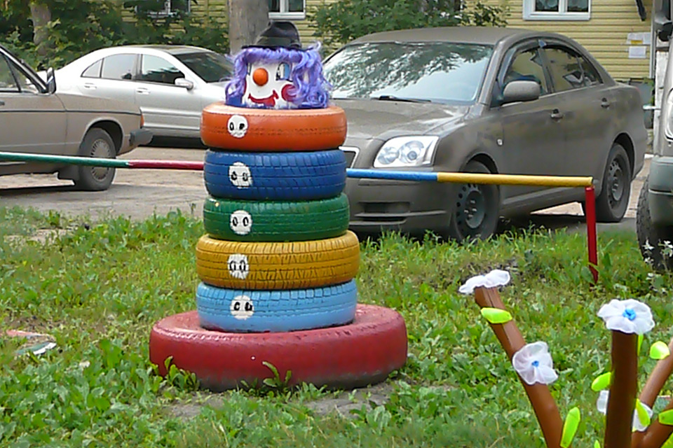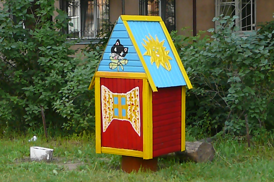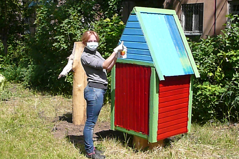 Сначала провели субботник: очистили двор от мусора, подстригли кусты, разбили цветники, позже из бревен соорудили беговую дорожку, песочницу, фигуры зверей. Вокруг дома высадили семь пирамидальных тополей.