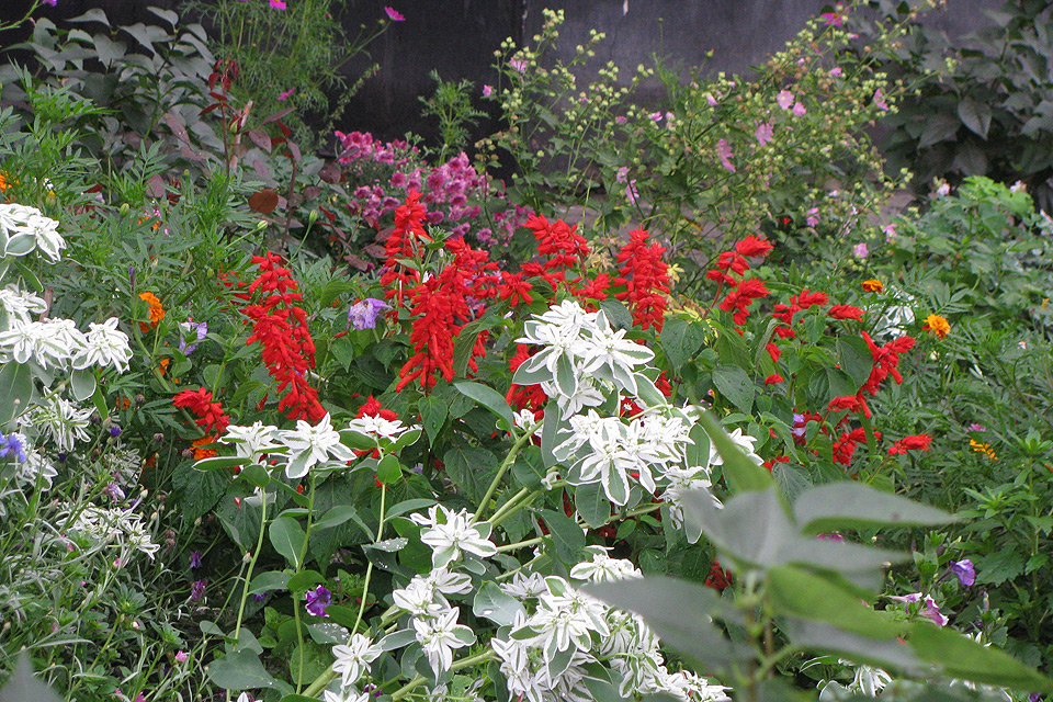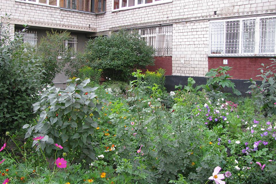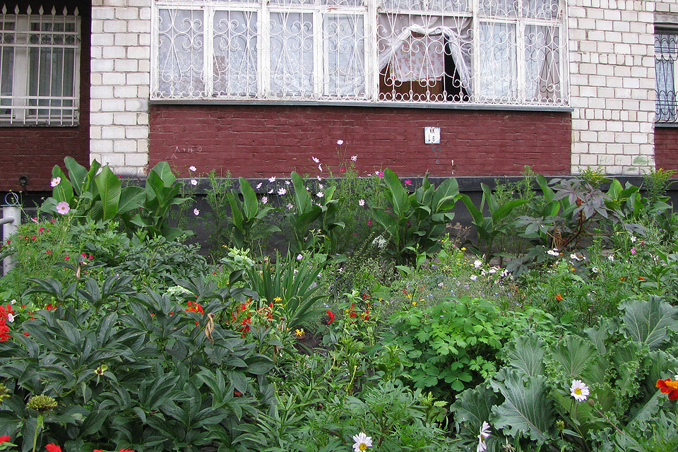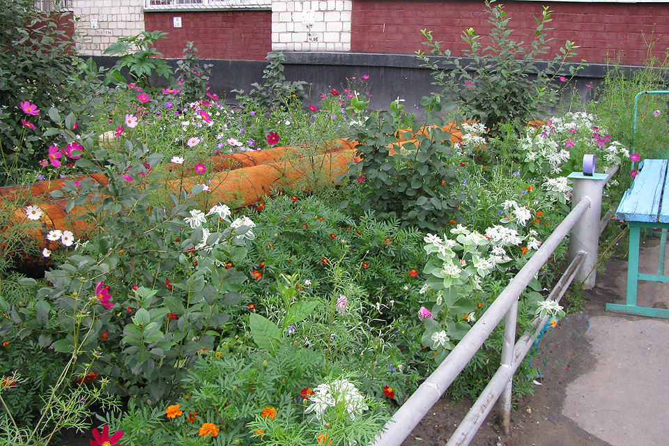 Богатый цветник под окнами дарит хорошее настроение всем жителям дома.