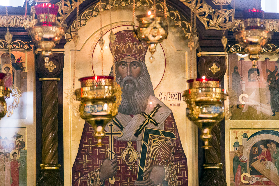 Нижний придел храма Успения Божьей Матери (ул. Тарская, 7) — здесь расположена рака с мощами священномученика Сильвестра Омского. Ежедневная служба в честь святого проходит в 15:00