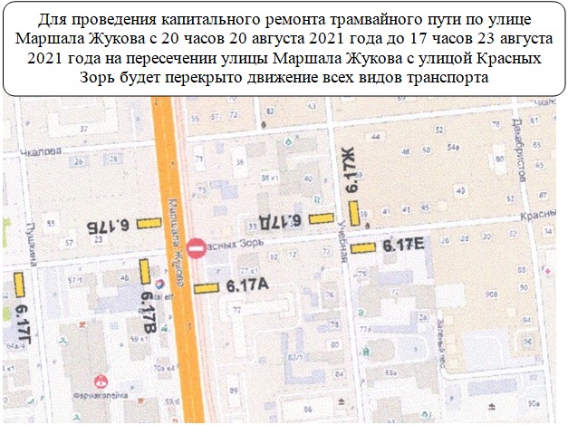 Движение трамваев будет перекрыто в связи с проведением капитального ремонта трамвайных путей. Проектом предусматривается объезд Маршала Жукова по улицам Масленникова, 10 лет Октября, Лермонтова, Куйбышева, Пушкина, Учебной.