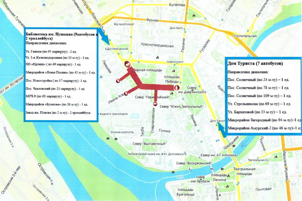 Автобусы маршрутов № 94, 500, 503 при движении в направлении Амурского поселка с моста имени 60 лет Победы поедут по улице Фрунзе с левым поворотом на улицу Герцена, далее по утвержденным схемам, в обратном направлении без изменения схем движения.