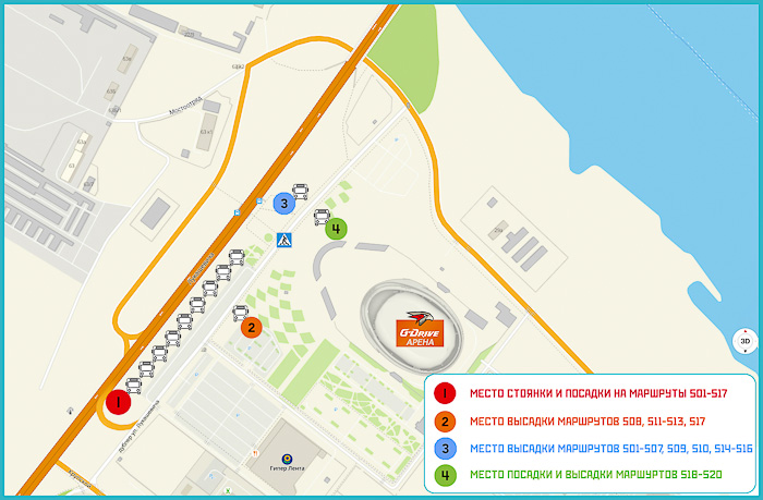 - посадка на автобусы, следующие по маршрутам 501-517, будет осуществляться на автобусной парковке (номер 1 на схеме), расположенной на противоположной от арены стороне проезжей части. Автобусы на парковке будут располагаться последовательно, в порядке нумерации маршрутов.