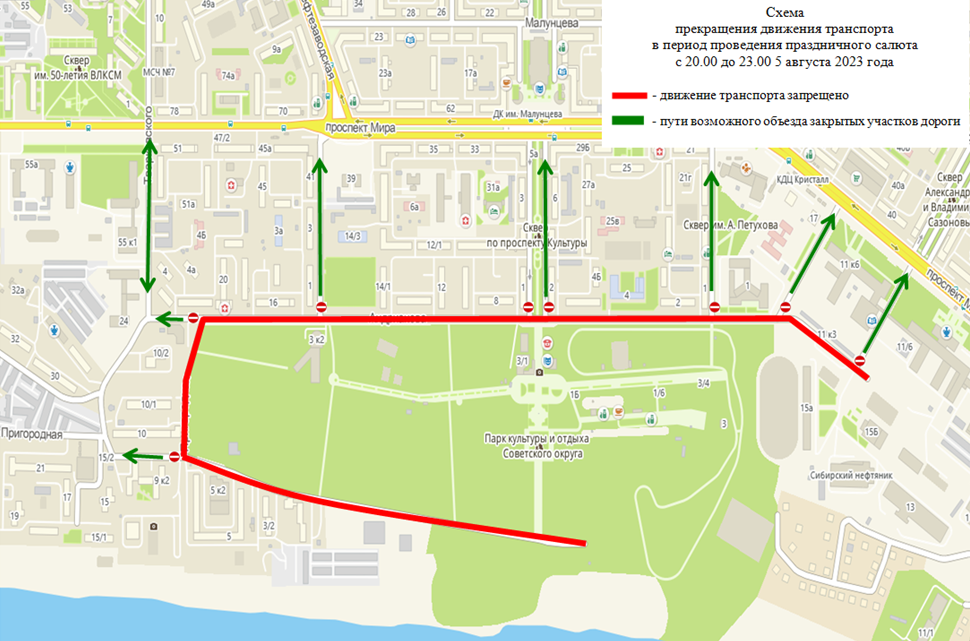 - с 20 часов до 23 часов 5 августа улица Иртышская Набережная на участке от улицы Циолковского до улицы Рождественского, включая Бульвар Победы и улицу Ф. Крылова на участке от улицы В. Иванова до Иртышской набережной; улица Андрианова на участке от улицы Пригородная до улицы Братьев Сазоновых, улицу Пригородная; улица набережная Тухачевского на участке от улицы Кемеровская до моста имени 60-летия Победы, улица Кемеровская на участке от улицы набережная Тухачевского до улицы Волочаевской.