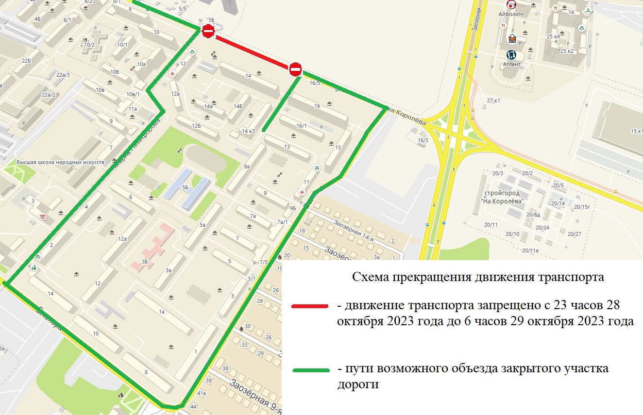 В связи с проведением работ открытым способом для прокладки новых подземных инженерных коммуникаций – тепловых сетей на проспекте Королева будет прекращено движение транспорта с 23 часов 28 октября 2023 года до 6 часов 29 октября 2023 года на участке дороги по проспекту Королева от жилого дома 16 по проспекту Королева до улицы М. Никифорова.