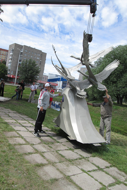 Со временем скульптура, изготовленная из бетона на железном каркасе, потеряла свои эстетические свойства и внешний вид и была демонтирована. Новая скульптура изготовлена в антивандальном варианте. «Лебеди — это символ крепкой и прочной семьи, — отметил автор скульптуры Сергей Козача, — и этот образ был взят за основу при создании скульптуры. Вожак своими крыльями помогает взмыть в небо и стать на крыло маленьким лебедям». В администрации Советского округа подчеркнули, что это один из примеров реализации общественной инициативы к 300-летию основания Омска, когда были успешно объединены усилия органов местного самоуправления, предпринимателей и коллектива акционерного общества. Участники проекта: АО «Транснефть — Западная Сибирь» (генеральный директор Олег Вячеславович Чепурной) и Совет предпринимателей Советского округа города Омска (председатель Виталий Викторович Богатырев). Общая стоимость проекта — 400 000 рублей.