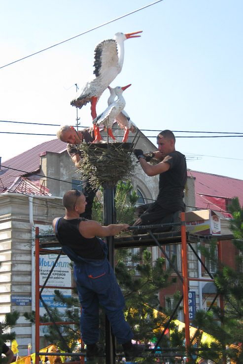 Им же предоставлено оборудование для монтажа и материалы для работы. Конструкция получилась красивой и надёжной. В залитый бетон установили основание, затем покрасили всё в яркие цвета, после чего из специального материала сплели настоящее гнездо. «Белоснежная птица с птенцами на крыше любого дома всегда символизирует счастье и любовь. И пусть наш подарок тоже станет символом удачи, счастья и мира над нашим городом!» — сказала Елена Ильенко, председатель КТОСа «Призаводской».