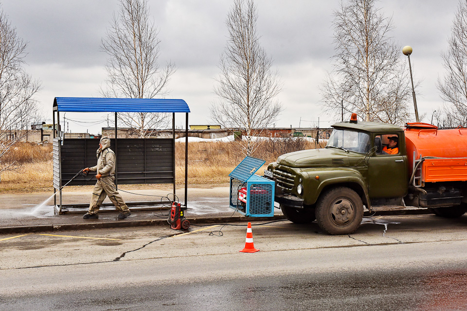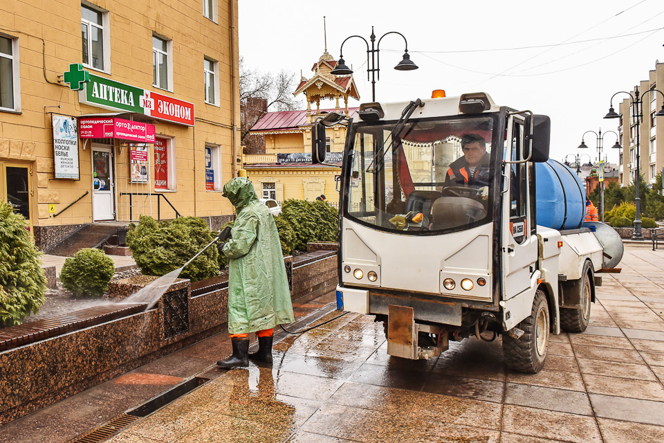 Городские службы ежедневно дезинфицируют общественные пространства. Обработаны проезжие части, тротуары, парковки, остановки общественного транспорта, парки и скверы.