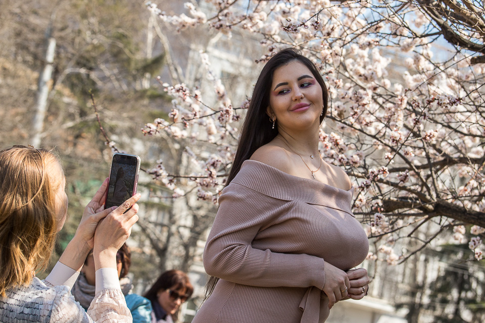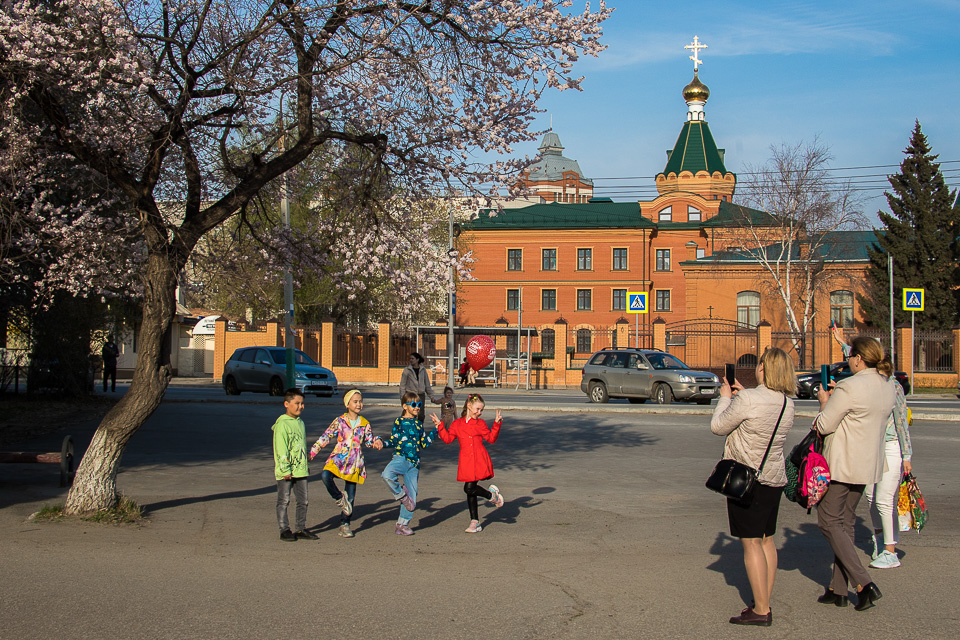 В конце апреля первым из городских плодовых деревьев зацвел абрикос. Прогуливающиеся по центру омичи не упускают возможности сделать яркие весенние фотографии, чтобы через социальные сети удивить друзей из других регионов.