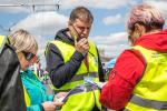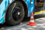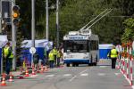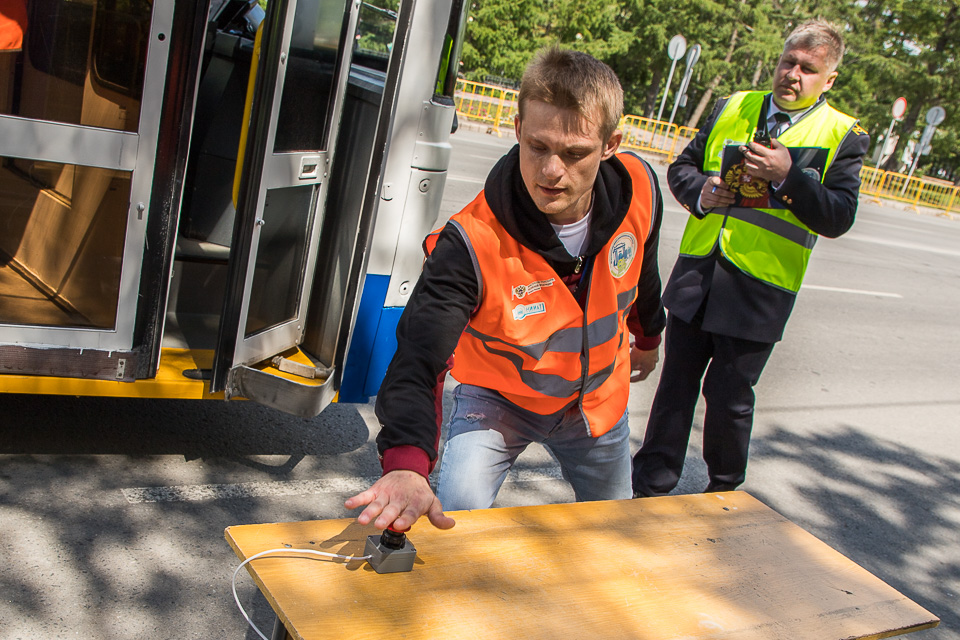 Судьи замеряют расстояние от троллейбуса до размеченного края платформы