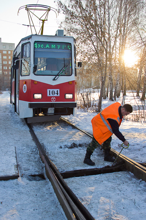 В трамвайном депо муниципального предприятия Омска «Электрический транспорт» вагон № 104 — уже девятый по счёту «откапиталенный» (см. фоторепортажи про модернизированные вагоны № 47 и № 57): старые машины основательно переоснащаются, чтобы ещё послужить омичам.