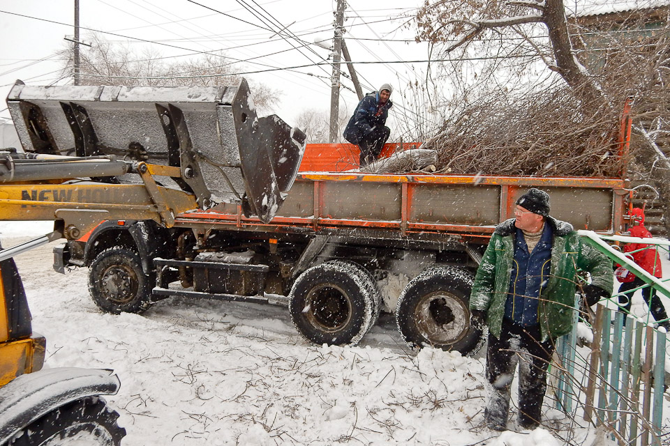 Выкорчеванные старые насаждения грузятся на спецтехнику