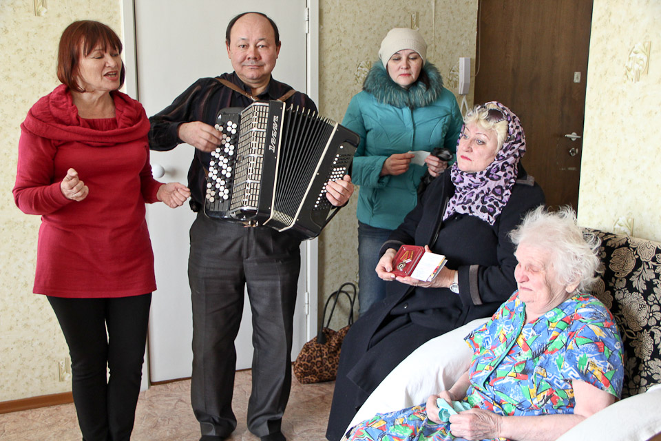 В последний день марта, уполномоченные представители Кировского округа совместно с вокальным ансамблем «Ретро» подарили героям Великой Отечественной войны настоящий праздник. Помимо вручения юбилейных медалей и искренних пожеланий, ветеранам подарили песни их молодости под звуки баяна.