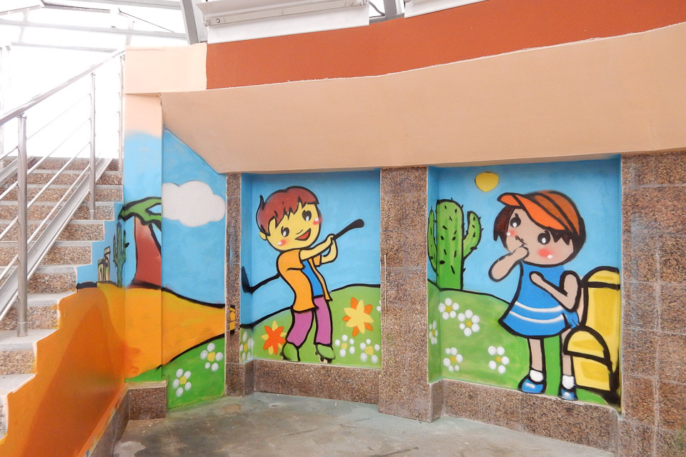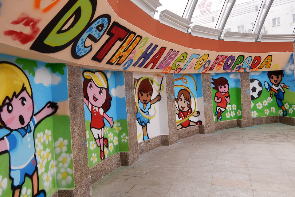 Юные художники оформили стены подземного пешеходного перехода на улице Щербанева на тему «Дети города и спорт».