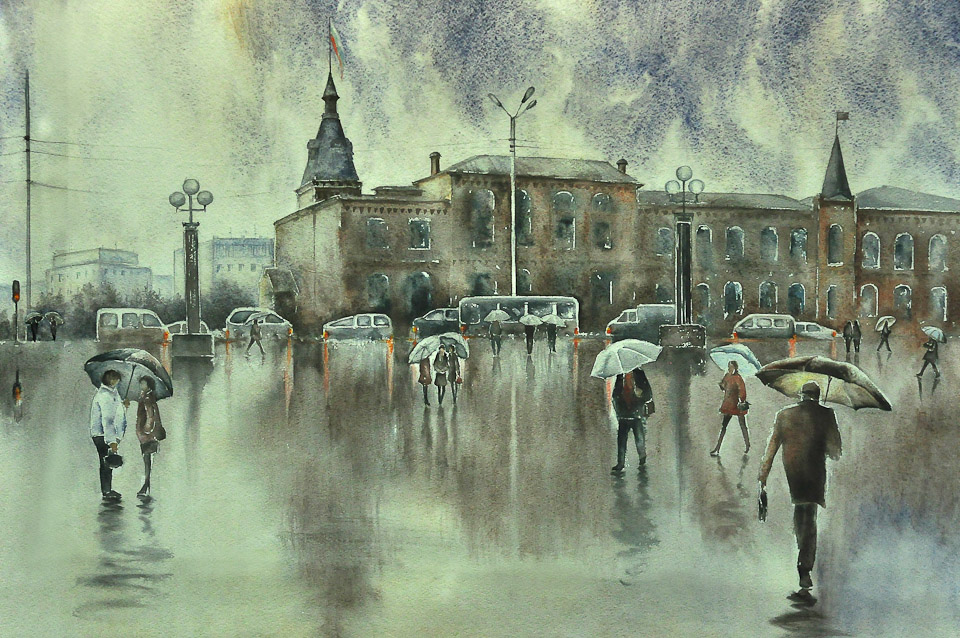 Гюльнара Хабибулина, 1968 г.р. Дождливый день. 2015. Бумага, акварель; 60×80. Поощрительный приз «Город»