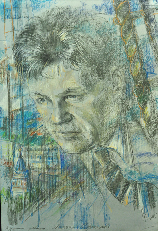 Расхат Нуриев, 1951 г. р. Художник Сорокин рисует поэта Сорокина. 2015. Бумага, пастель. 100×70. Главный приз Администрации города Омска за лучшее произведение