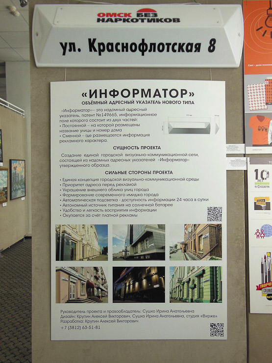 Ирина Сушко, 1964 г. р. Объёмный адресный указатель со съёмным полем для размещения рекламы, надомный, с подсветкой. 2014.Указатель: полистирол ударопрочный; 121×36. Планшет, цифровая печать. 150×100. Второе место в категории «Средовой дизайн»