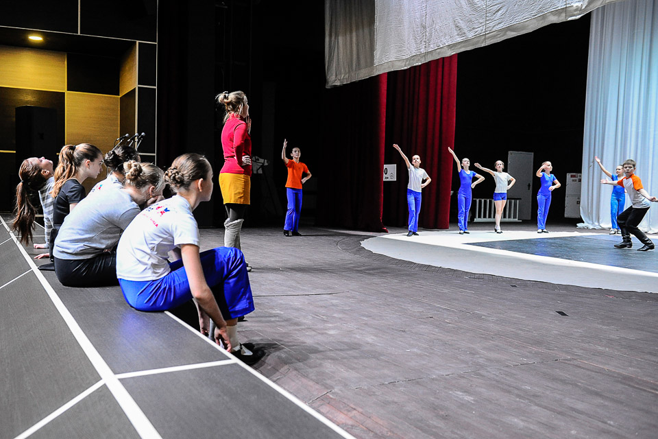 Репетиция танцевального ансамбля на главной сцене перед началом праздника