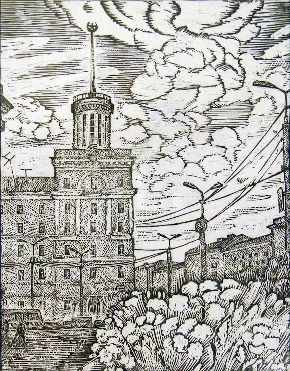 Николай Герасимов. Остановка. 1978. Бумага, шариковая ручка, акварель, белила Александр Галковский. Ленинградская площадь. 2013. Бумага, линогравюра Николай Герасимов. Старая башня. 1978. Бумага, шариковая ручка