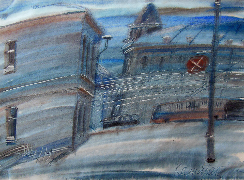Павел Абрамов. Последний трамвай. 1995. Бумага, меццо-тинто Геймран Баймуханов.  Полдень на Куйбышева. 2001. Холст, масло Василий Белан. Железный мост. 1963. Бумага, акварель