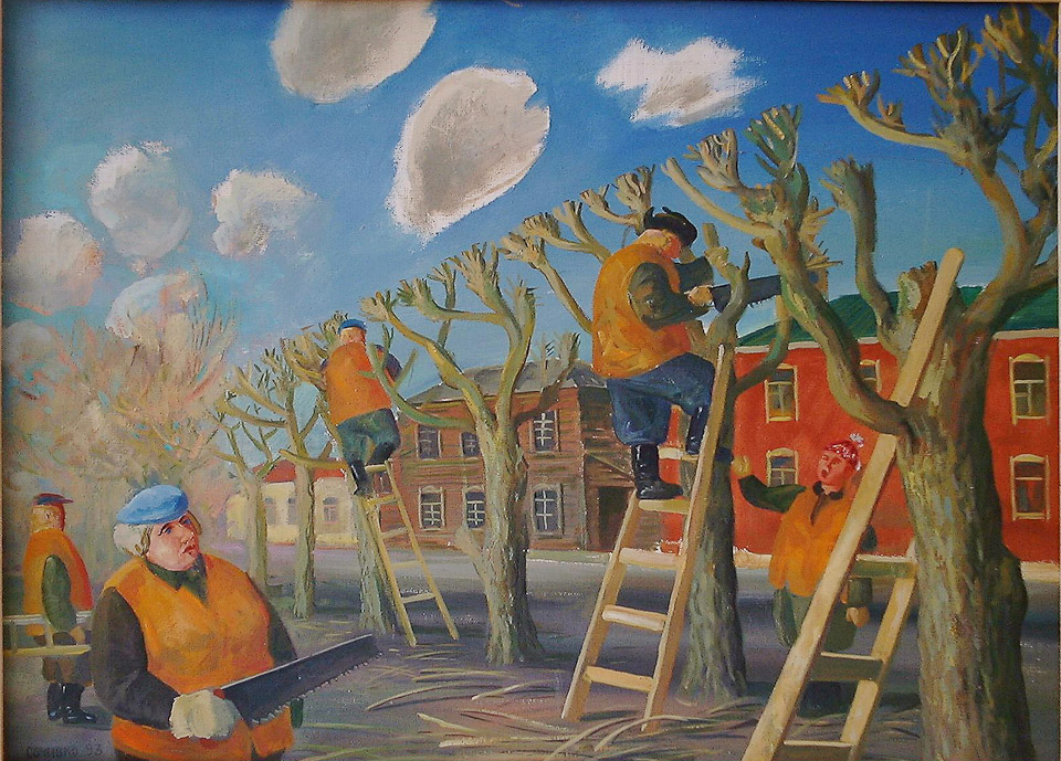 Борис Миронов. Утро. Город. Стрижка деревьев. 1991. Бумага, офорт