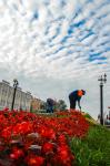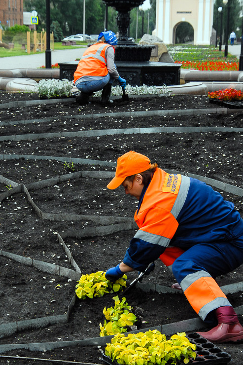 Озеленители создают новую ландшафтную композицию в центре Омска. Она посвящена Чемпионату мира по футболу, который проходит в России в эти дни.
