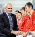 Мальчишки жмут руки известным самбистам и берут у них автографы. Это открытые всероссийские соревнования по борьбе самбо на призы Почетного гражданина города Омска, заслуженного мастера спорта СССР Александра Пушницы.