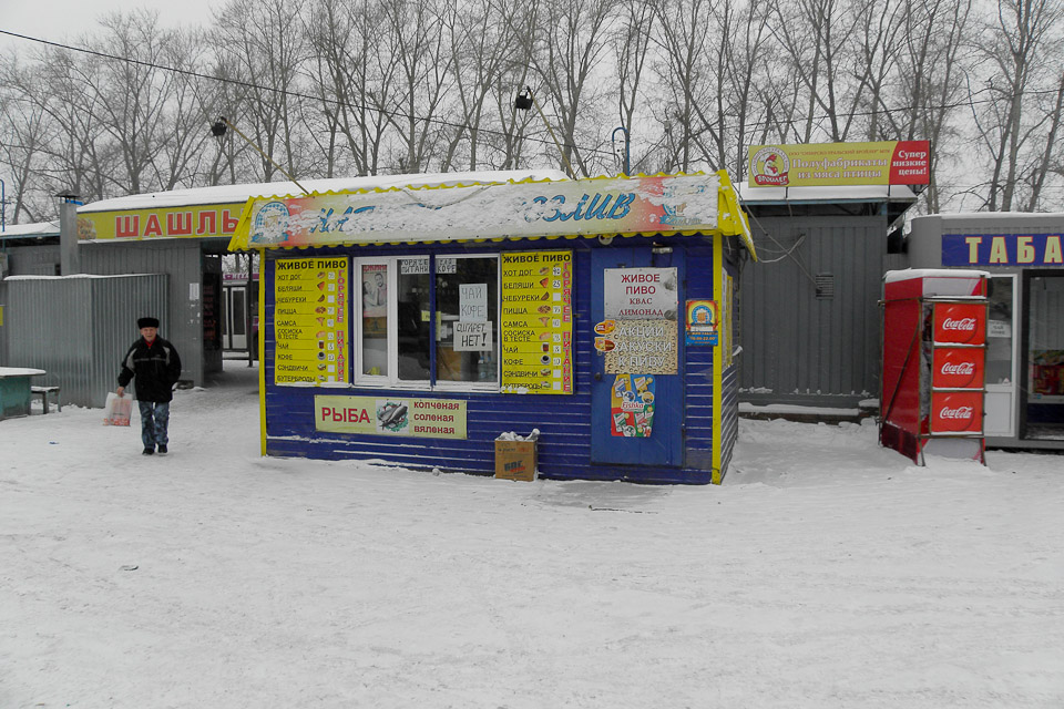 Какой неряшливый киоск: немытый, обклеенный объявлениями. Можно ли здесь купить что-то на стол?