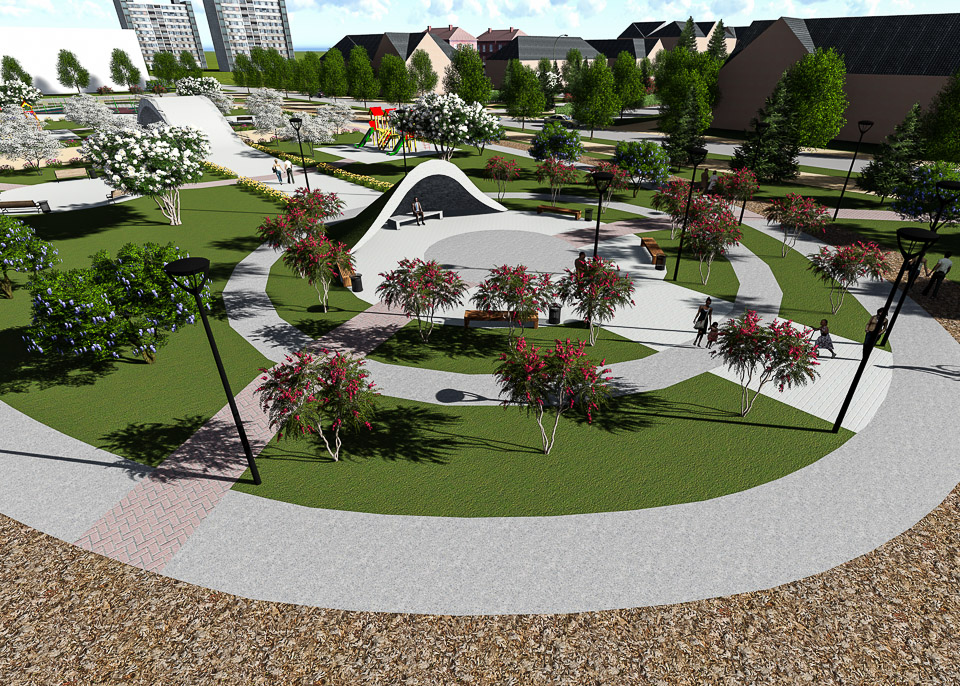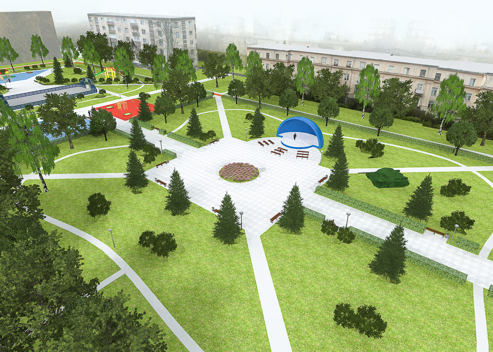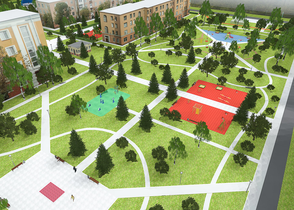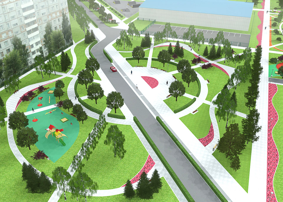 Привести в порядок тротуары и пешеходные дорожки, правильно, с учетом реальных потребностей горожан разместить игровые и спортивные площадки, поставить лавочки и урны, проложить велодорожку, восстановить газоны и разбить цветники, придумать, как грамотно разместить мини-площадки для спокойного отдыха, посадить деревья — и не «прутики», а полноценные крупномеры: в дизайн-проекте архитектор использовал «тактику малых дел», чтобы добиться максимального результата — создать пример по-настоящему комфортной городской среды в Комсомольском городке.