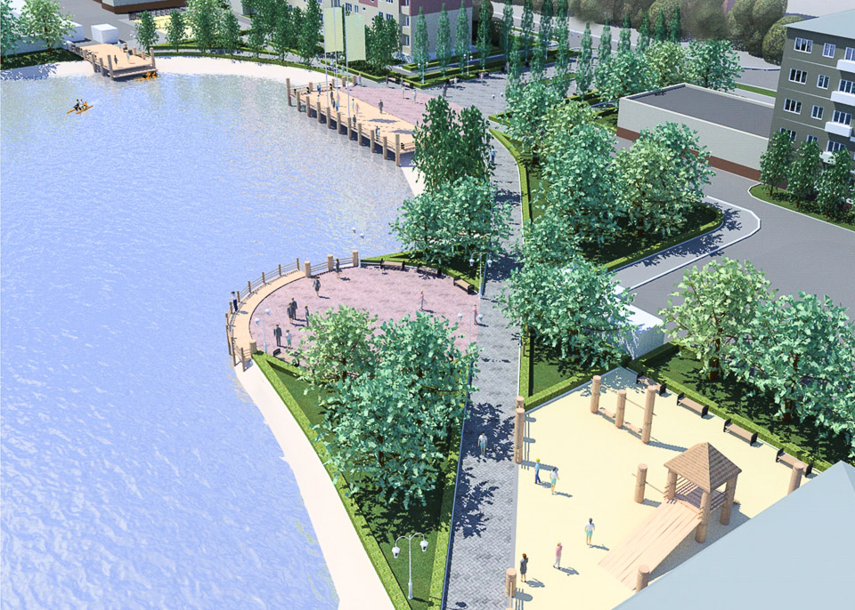 Удобные зоны отдыха, прокат лодок и катамаранов, смотровые площадки, специально отведенные места для любительской рыбной ловли — так может преобразиться территория вокруг водоема, если за него проголосуют горожане. Не забыли проектировщики и о том, что рядом находится детская поликлиника № 4. Специально запланированы игровые площадки с оригинальными деревянными малыми архитектурными формами. Естественно, проработан вопрос озеленения — изюминкой должны стать белые ивы и пирамидальные тополя.