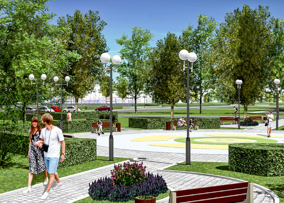 Здесь будет все для тихого отдыха — любимого вида досуга семей с детьми. Пешеходные дорожки, красивые и удобные малые архитектурные формы, необычная длинная скамья-лента и навесы, которые хорошо защитят от солнца в жаркий день, живые изгороди, о которых так долго мечтали местные жители, — конкретные архитектурные решения, предложенные в дизайн-проекте, небанальны и свежи. Учтены существующие пешеходные транзиты. Впрочем, сделано и важное дополнение — предусмотрено создание велодорожки.