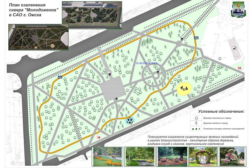 Отремонтировать тротуары, пешеходные дорожки, аккуратно обновить газоны и цветники, добавить декоративные элементы, стилистически связать его с Любинским проспектом и скверами Омского академического театра драмы — этого будет достаточно, чтобы зеленая зона заиграла по-новому. На это и нацелен разработанный дизайн-проект.